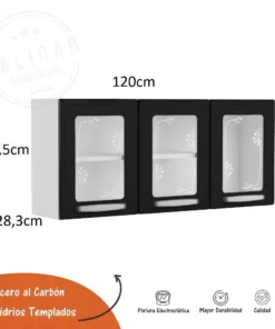 Su tono negro lo hará resaltar sobre cualquier mueble de tu baño o cocina, recubierto de pintura electrostática para mayor durabilidad y manufacturado a partir de acero al carbón, lo hace tu prioridad al escoger una alacena para tu hogar. Contiene tres compartimentos en su interior los cuales lo hacen un mueble bastante amplio para almacenar objetos, el interior es accesible mediante sus tres puertas con vidrio templado y agarre de acero bastante duradero.