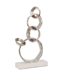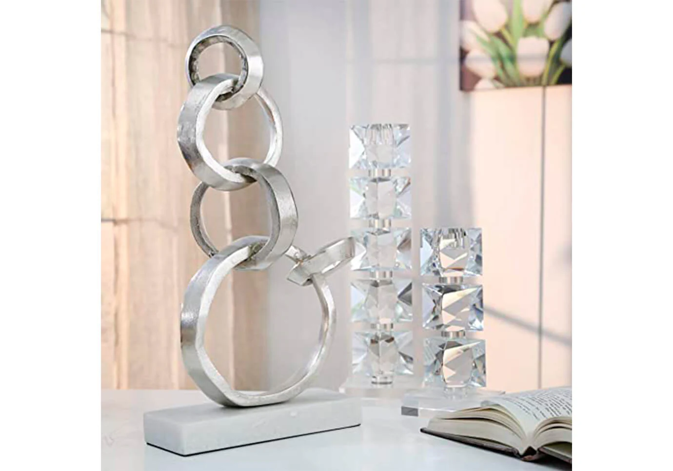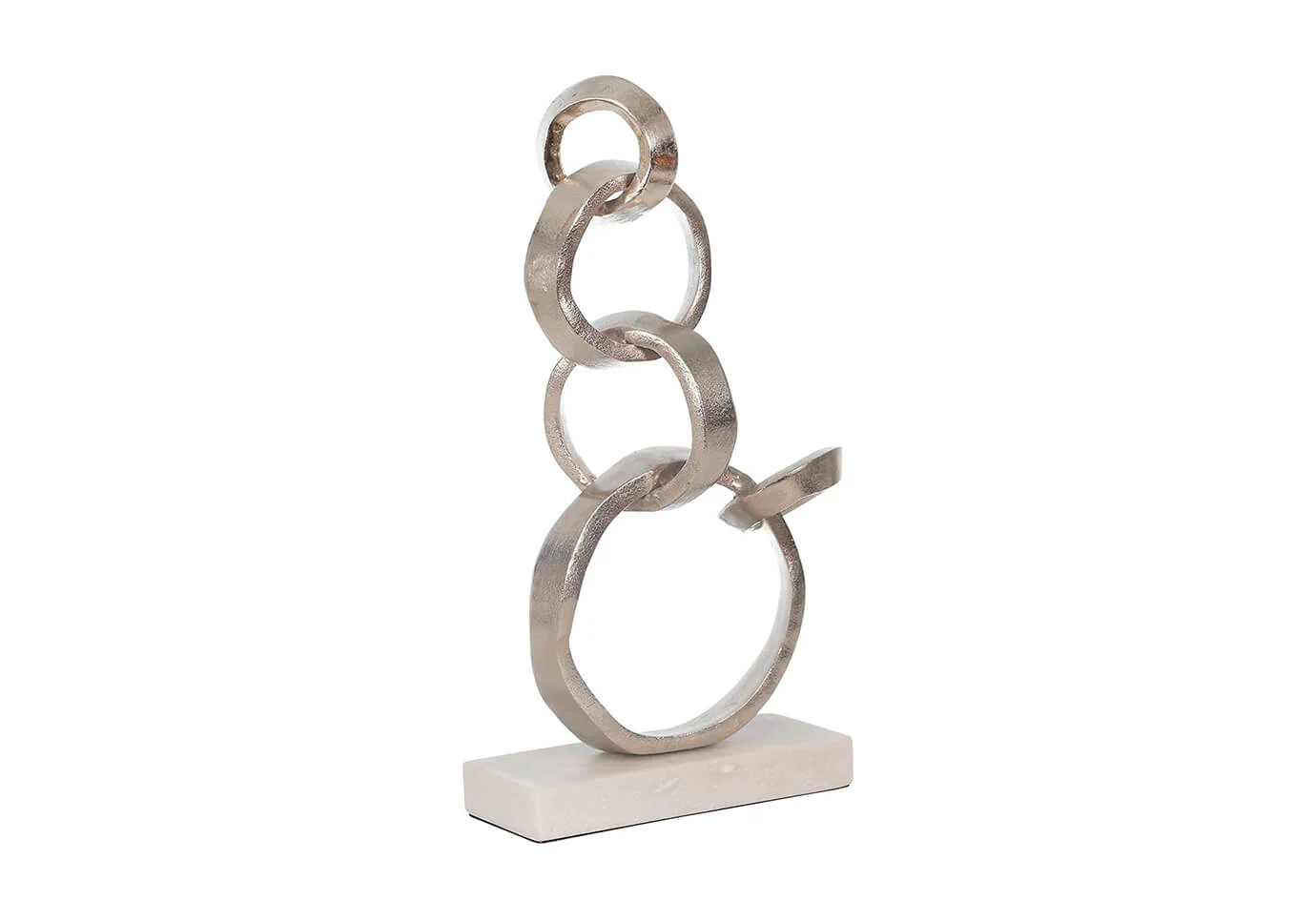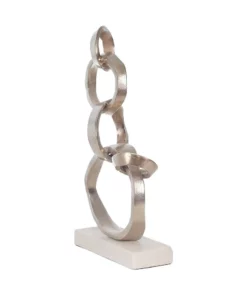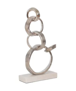 Escultura metálica de aros color plateado sobre base de mármol blanco.