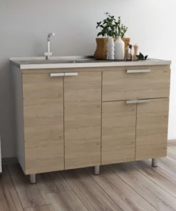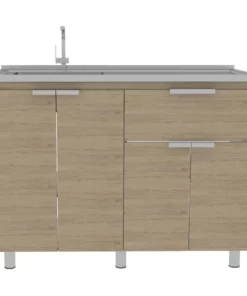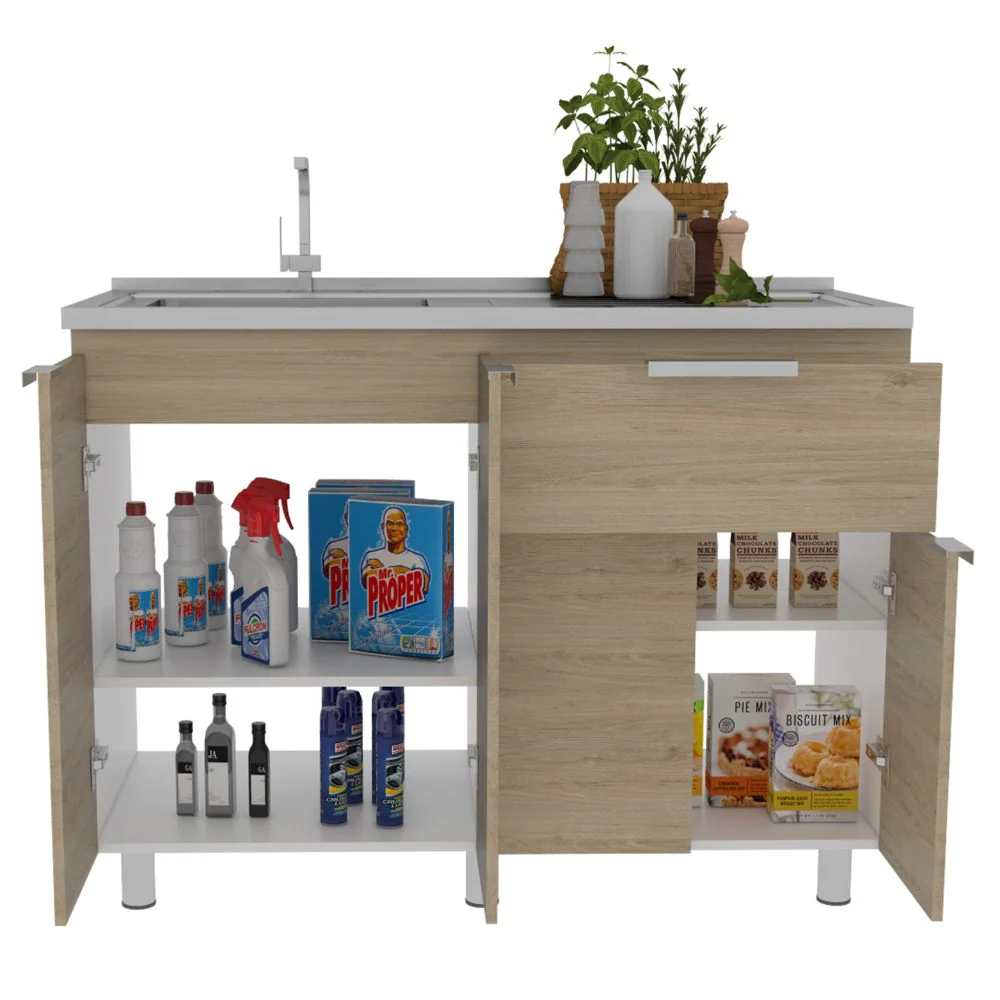 Gabinete Inferior, con 1 cajón, variedad de entrepaños, 4 puertas batientes, y, patas metálicas Incluye mesón