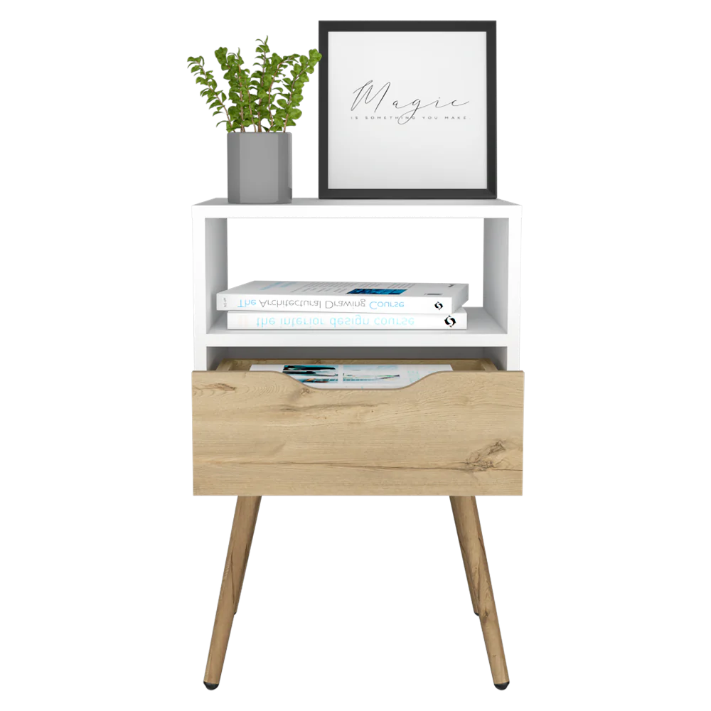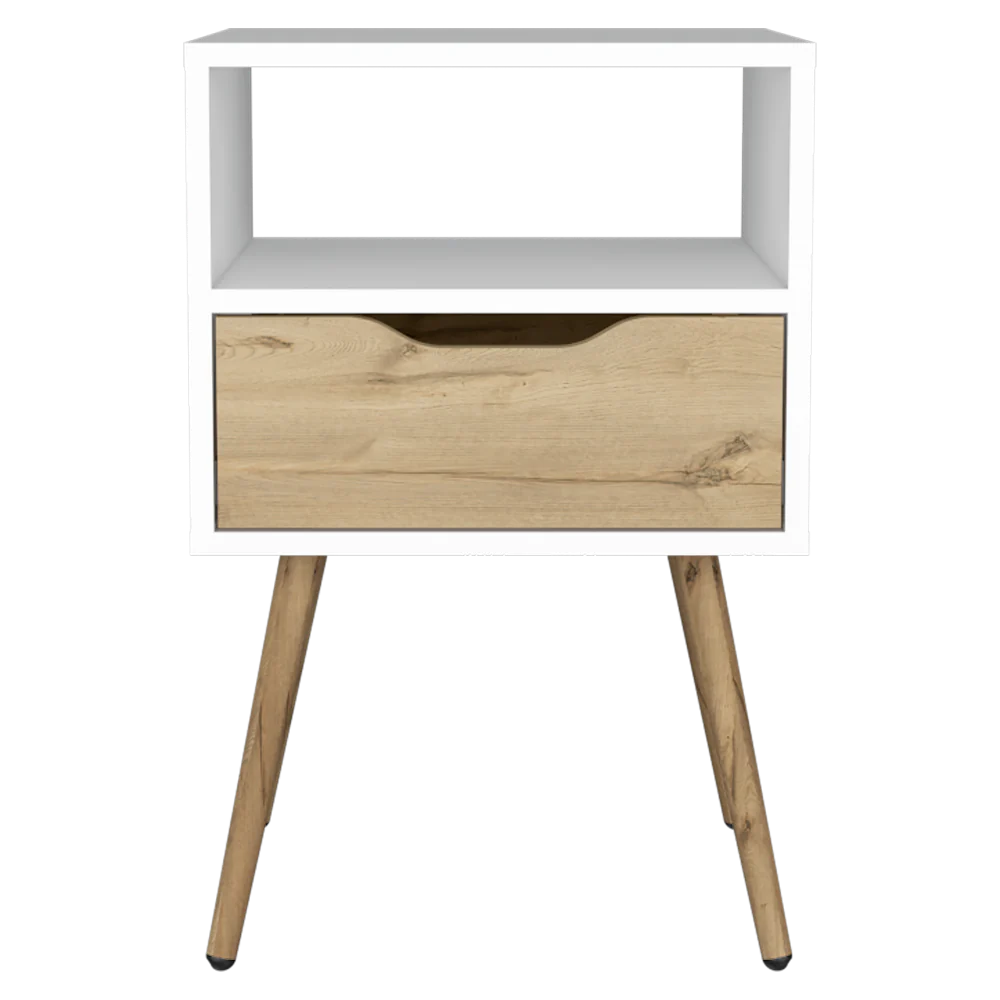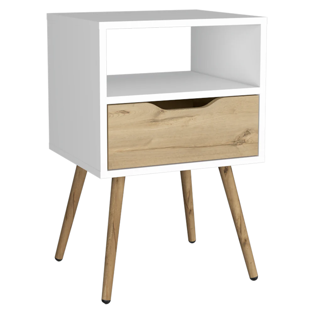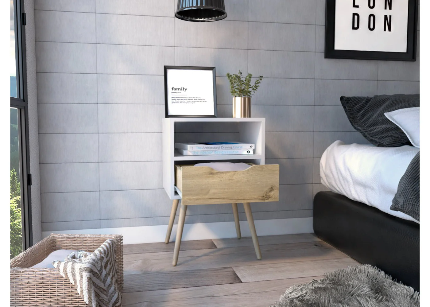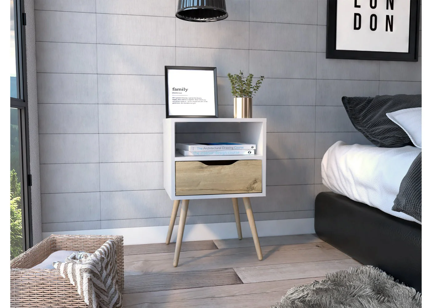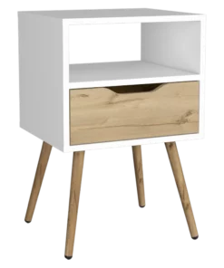 Mesa de noche, con acoplamiento ideal en dormitorios modernos, espacio para almacenar objetos pequeños, incluye un cajón.